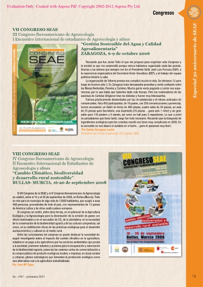 Este Congreso, simultáneo al III Encuentro Iberoamericano de Agroecología y al 1er. Encuentro Internacional de Estudiantes de Agroecología y Afines, se celebró en Zaragoza en 2006. Carlos Zaragoza Larios (112) fue el presidente del Comité Organizador. Se adjunta sus recuerdos del evento ahora publicados por la revista "Agricultura Ecológica" en el 30 aniversario de la SEAE. Ver resumen y fotos adjuntas.