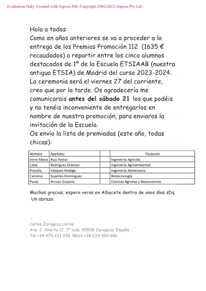Se vuelven a entregar (por quinta vez!) los famosos y sorprendentes premios a los cinco alumnos más destacados de primer curso 2023-2024 de la Escuela Tecnica Superior de Ingeniería Agronómica y Medioambiental de Madrid que ofrece la Promoción de Ingenieros Agrónomos 112 en el marco de la Fundación Premio Arce. En esta ocasión todas las premiadas son mujeres. Se adjunta texto de la convocatoria de entrega y foto Ceremonia de Entrega de Premios 2018.